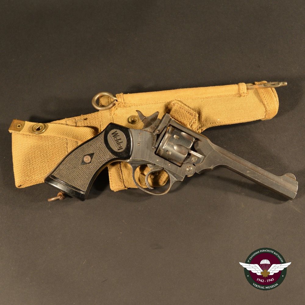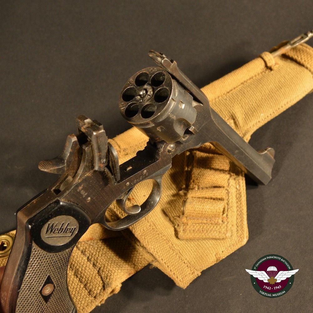 Hanson can be seen in the photo wearing a webbing style holster on his right hip. This would have contained a Webley revolver as seen here. You will notice he has the revolver tethered to himself with the use of a lanyard in order not to lose his sidearm.