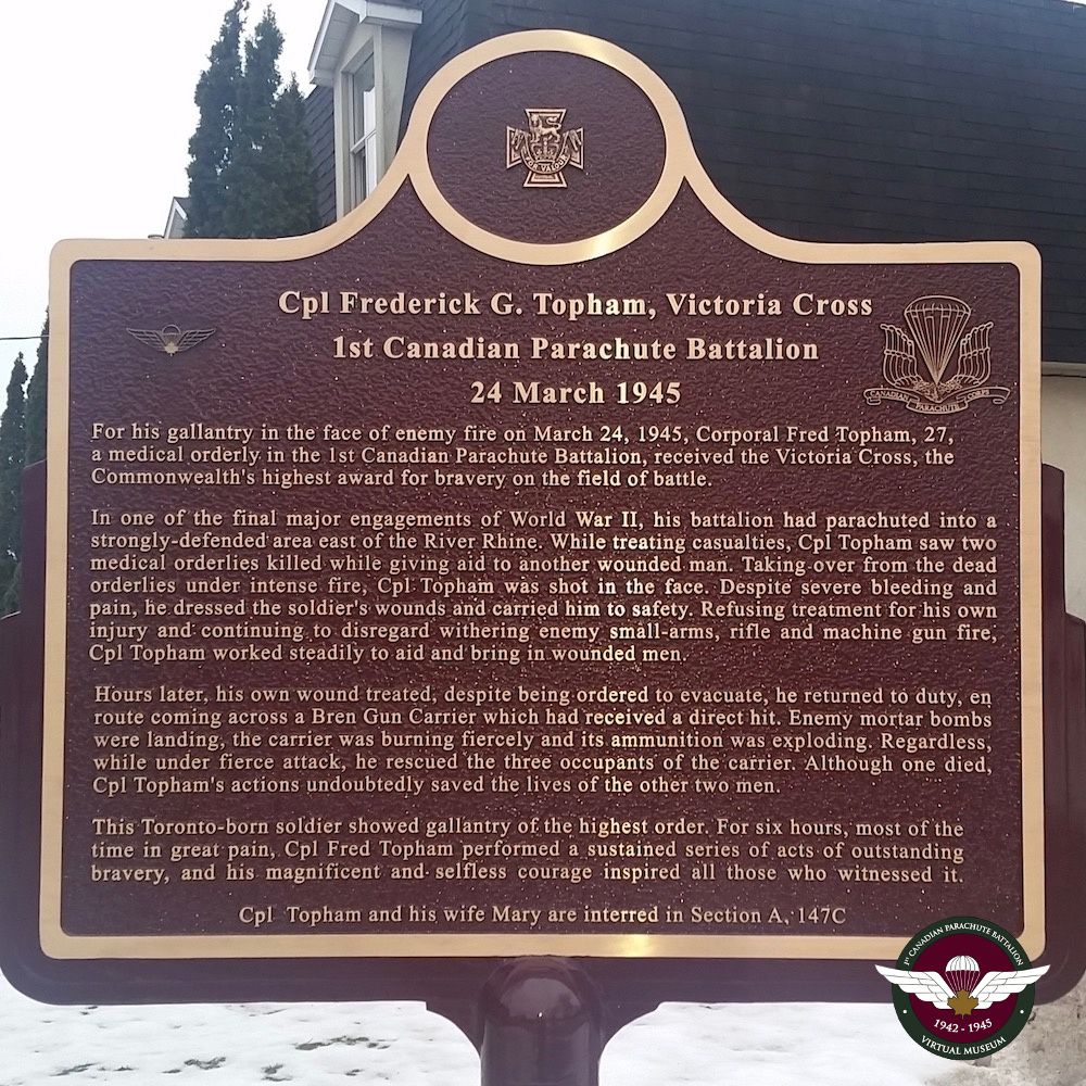 Cpl Topham parachuted during a daring day time jump on Operation Varsity on March 24, 1945 where he was met with a fierce firefight and wounded. He served in France, Belgium, Holland and Germany. It was during Operation Varsity where Topham won the highest gallantry award bestowed by the British Empire, the Victoria Cross, which made him the only member of the Battalion and the 6th Airborne Division to receive such an honour. After the war, Topham briefly served with the Toronto Police Service before changing careers to Toronto Hydro, where he worked until his untimely death on May 31, 1974. If you wish to visit this Canadian war hero, he is resting at the Sanctuary Park Cemetery, 1570 Royal York Road, Etobicoke, Ontario M9P 3C4. Section A, Lot 147C.